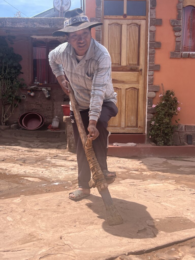 Ce n’est pas pour faire du commerce, juste de quoi nourrir la famille. Ici pas les moyens (et tant mieux) pour des produits chimiques : une agriculture sobre, physique, respectueuse de la terre, où tout le monde met la main à la pâte… avec l’aide des ânes (jusqu’à 50 kg chacun !). Louis fabrique même ses propres outils. Il achète juste le métal pour le reste c’est le cuir des vaches et le bois local. Quant aux lamas ils permettent aux familles de se nourrir et aussi de se vêtir chaudement car même à la bonne saison les nuits sont glaciales ici. Antonia confectionne et vends d’ailleurs ses créations : bonnets, gants, pulls et bandeaux.