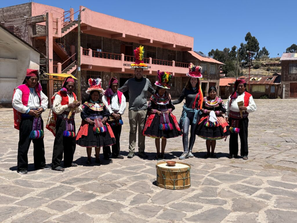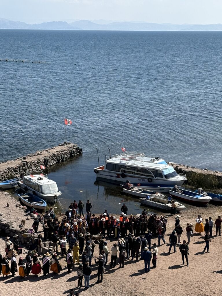 Après un long trajet en bus, nous arrivons à Puno, au lever du soleil. Le froid pique un peu, mais le spectacle est grandiose. Un ciel flamboyant, le lac immense, et cette impression d’être face à quelque chose de sacré.