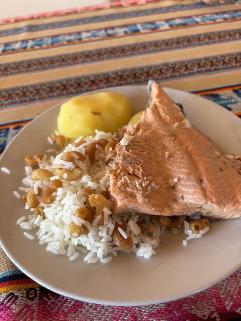 Antonia et Myriam nous régalent de soupes, de pommes de terre bien sûr, mais aussi de crudités et de poissons fraîchement pêchés dans le lac (perche et truite).