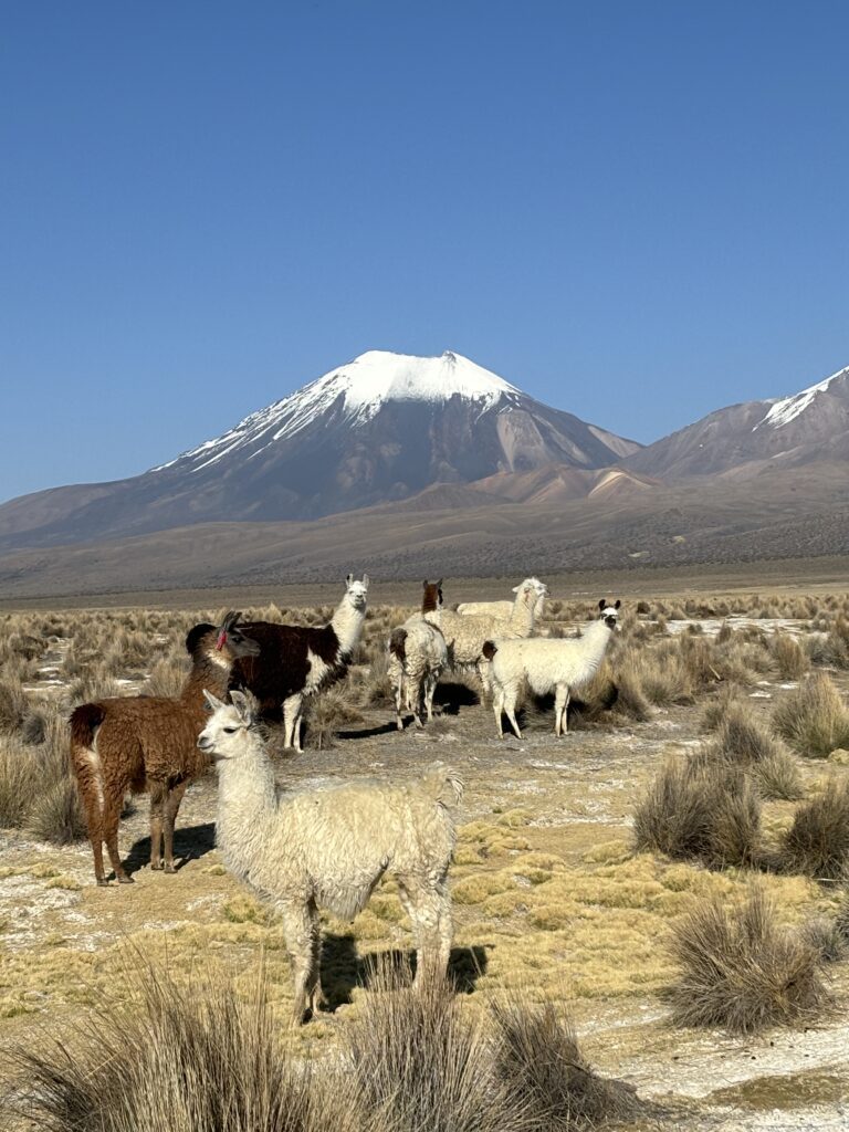 En toile de fond, le volcan Sajama, encore actif, se dresse majestueusement, point culminant du pays à 6 545 mètres.