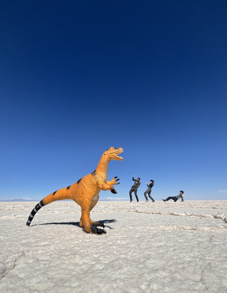 Limber, en plus d’être un guide passionné et un chauffeur expérimenté, est aussi un photographe talentueux. Il nous propose une séance photo en “perspective”, ces clichés ludiques typiques du Salar. On se prend vite au jeu face au dinosaure… fou rire garanti !