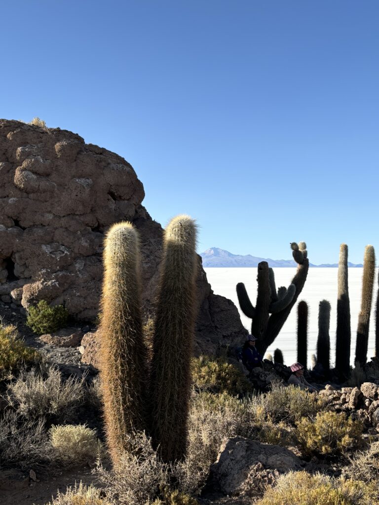 Quand nous atteignons l’île d’Incahuasi, le spectacle devient surréaliste. Des cactus géants, vieux parfois de mille ans, se dressent au milieu de cette mer blanche. Les Incas vivaient ici autrefois, se nourrissant des fruits du “pasacana”, un fruit proche du kiwi. Le silence est total, seulement brisé par le vent et nos pas sur le sel.