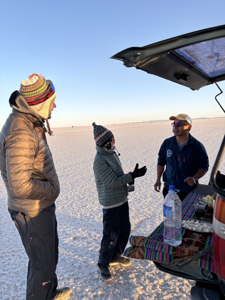 À la tombée du jour, Limber nous prépare une surprise : apéritif face au coucher de soleil, vin bolivien, fromage de chèvre, chips croustillantes. Le ciel se métamorphose en un dégradé de jaune, d’orange, de violet puis de bleu profond. Une étoile apparaît, puis une autre, filante celle-là. Célian, les yeux levés, s’exclame : « C’était fou ! ». Ce moment suspendu restera gravé dans nos mémoires.
