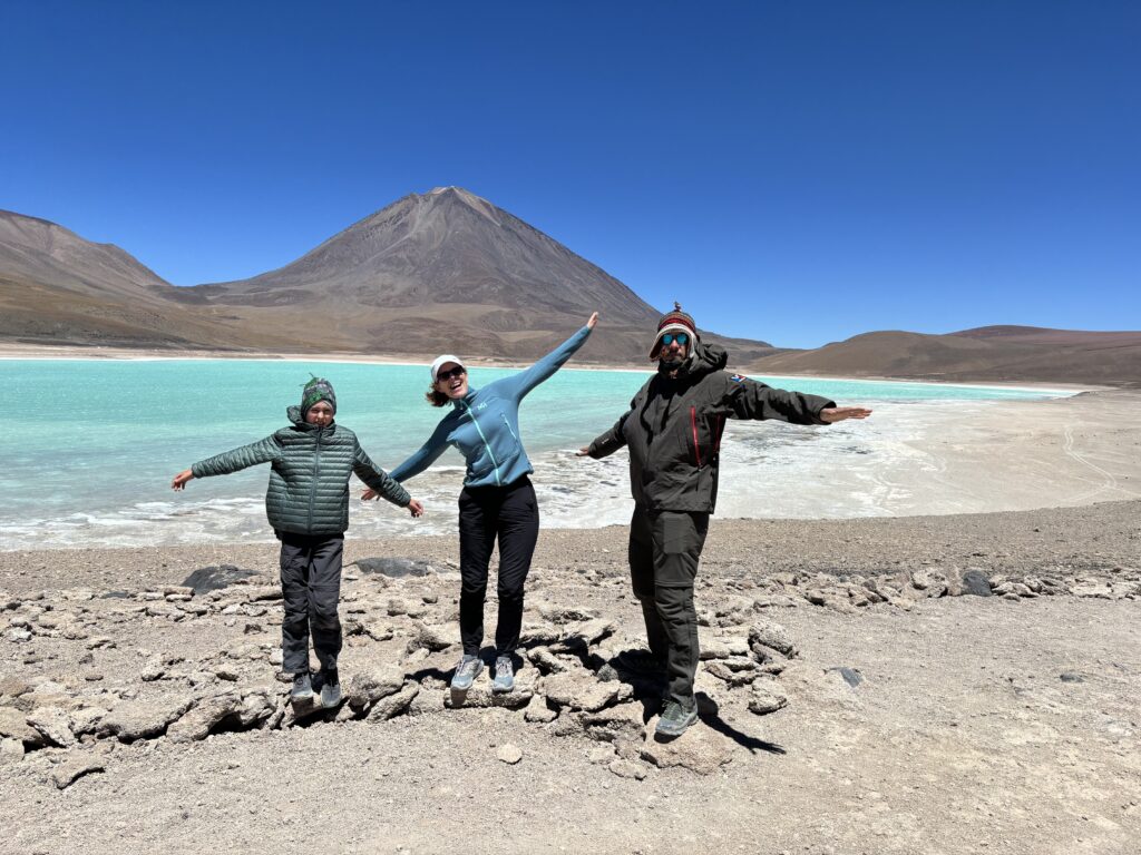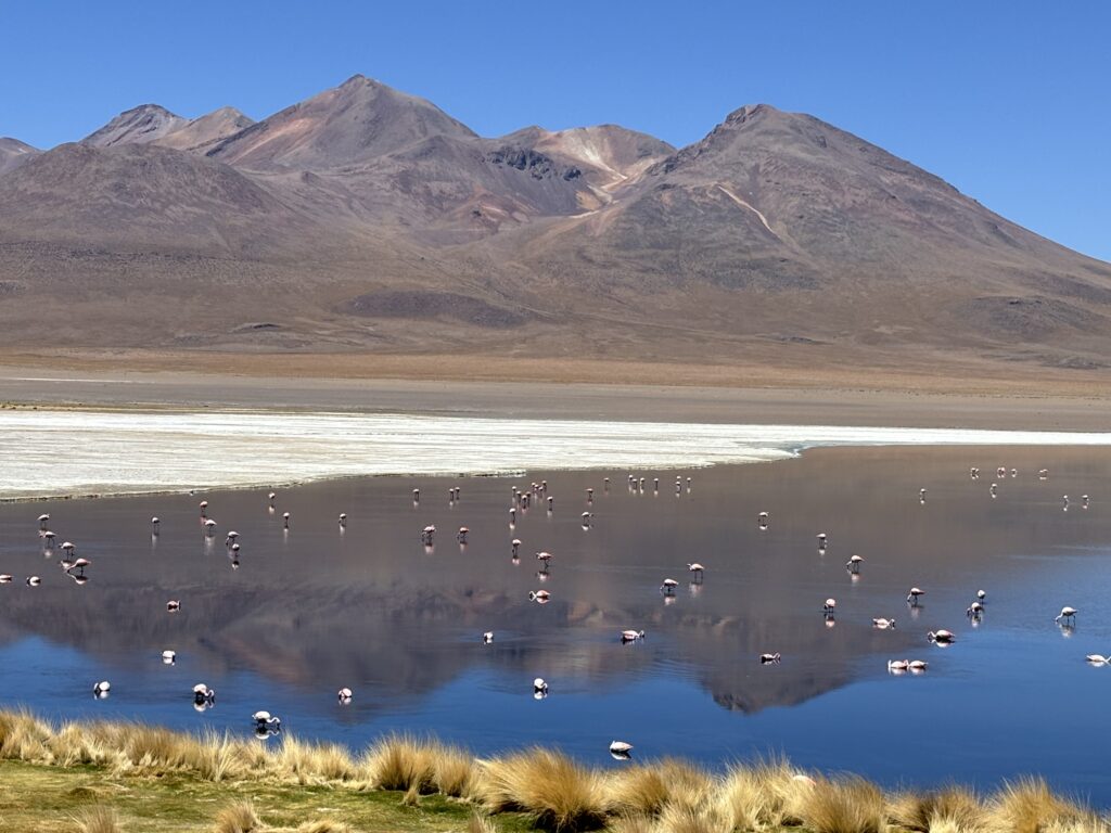 La piste se perd dans l’immensité du Salar de Chalviri. Le volcan Ollagüe fume au loin. Puis viennent les lagunes : Cañapa, Charcota, Honda. À chaque arrêt, la beauté nous coupe le souffle. Les montagnes se reflètent dans l’eau turquoise, le ciel se confond avec la terre, et les flamants roses animent le décor de leurs silhouettes gracieuses.
