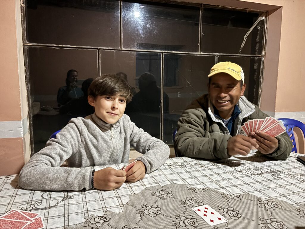 Célian, installé à l’avant, prend très à cœur son rôle de copilote. Avec Limber, la complicité s’installe. Malgré la barrière de la langue, ils échangent des regards, des gestes, des sourires. Et le soir venu, les cartes s’invitent à table : le UNO, c’est international ! Entre deux fous rires, nous lui apprenons même à jouer au Président. Ces moments simples font partie des plus beaux souvenirs de notre voyage.