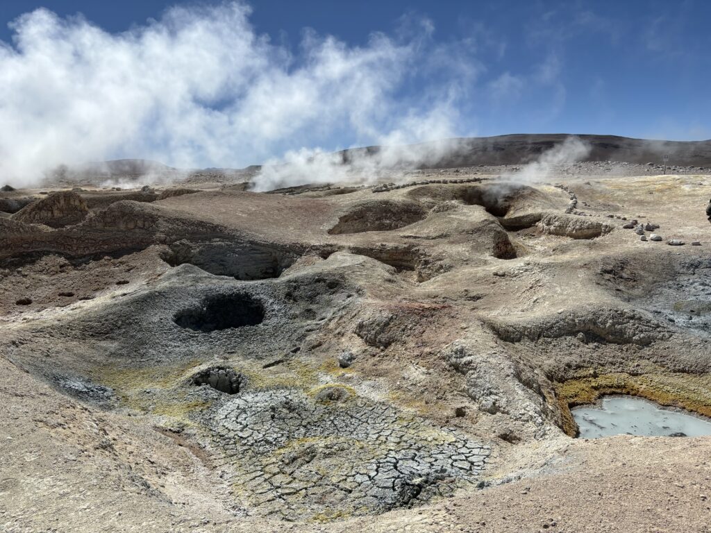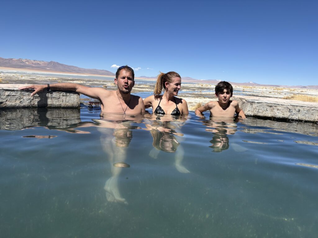Nous terminons la journée dans les sources chaudes de Polques, à 35 degrés, face aux flamants et aux vigognes. L’eau chaude, le soleil et la montagne : tout semble irréel.